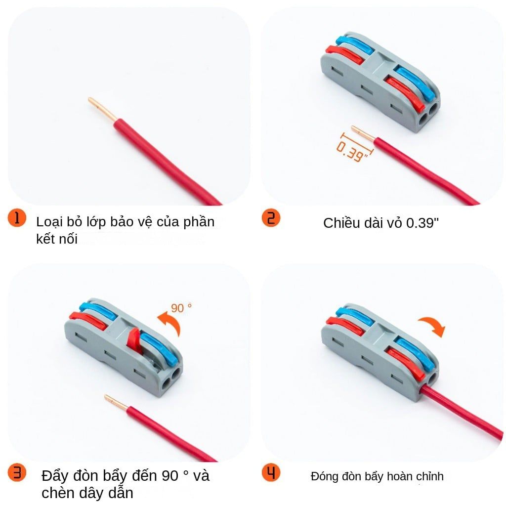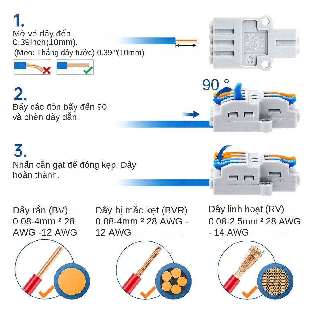 Đặc điểm Cút nối dây điện nhanh KV giúp kết nối dây điện nhanh chóng, đảm bảo mối nối an toàn và chắc chắn. Dễ dàng đóng/mở, tái sử dụng nhiều lần, tiết kiệm thời gian và chi phí. Thông tin chi tiết Dùng cho dây: Lõi mềm: 0.08 - 2.5mm² Lõi cứng: 0.08 - 4.0mm² Điện áp tối đa: 600V Dòng tải tối đa: 32A Chất liệu: Nhựa chống cháy Chi tiết phân loại Cút nối dây đơn: