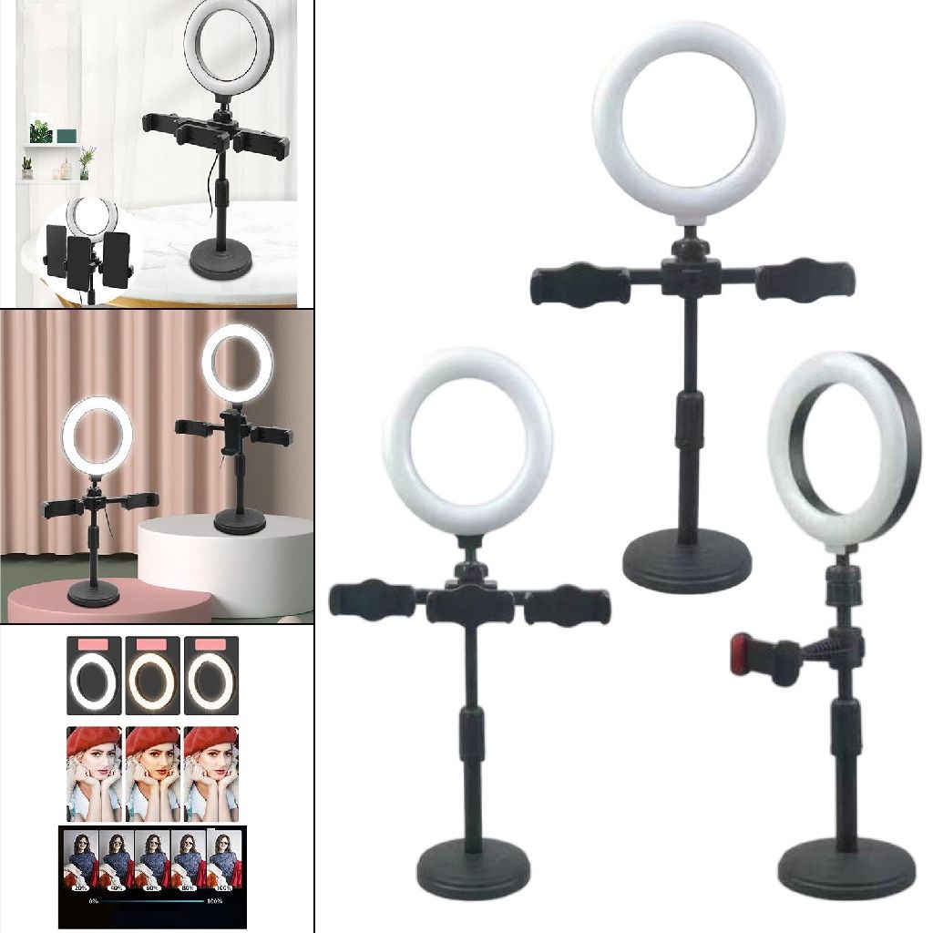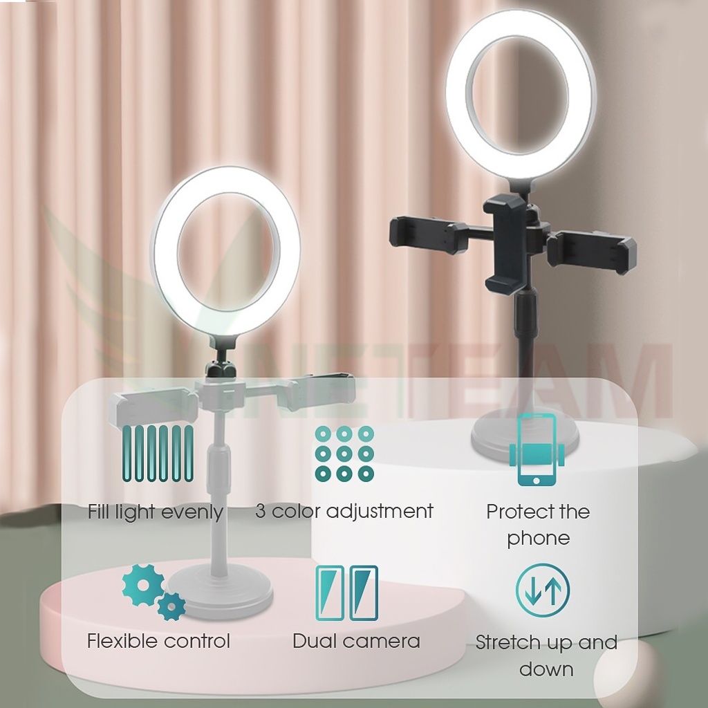 Đèn Livestream 3 in 1 Tích Hợp Giá Đỡ 3 Điện Thoại Có 3 Chế Độ Sáng, Kẹp Điện Thoại Để Bàn Quay Video