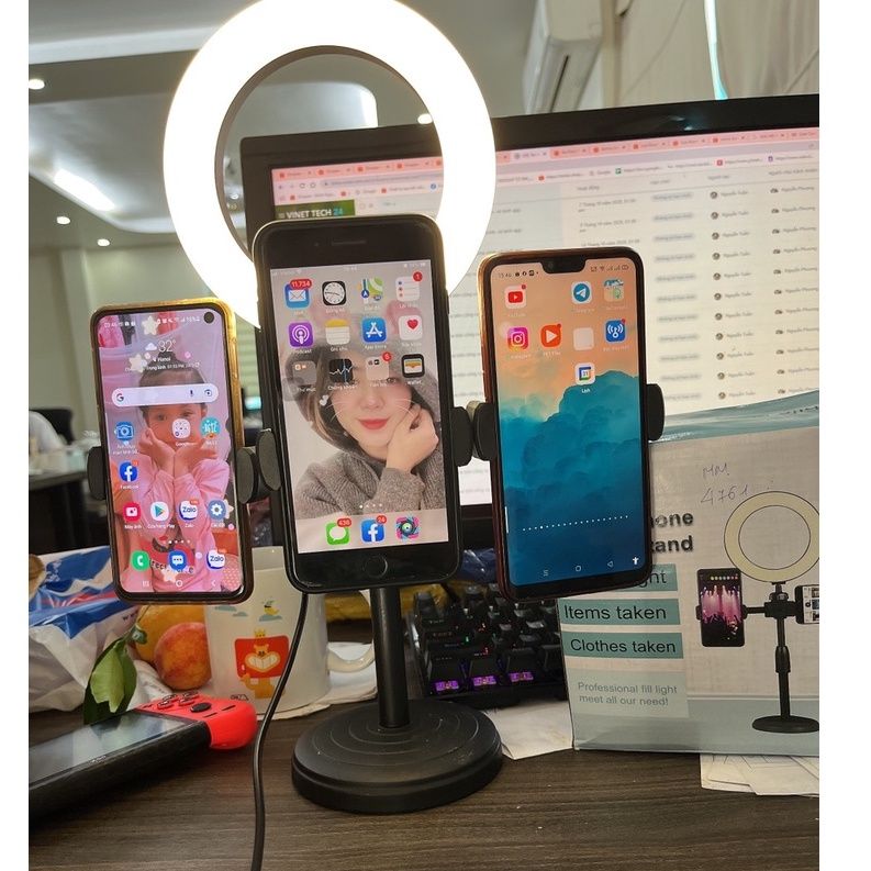 Đèn livestream bao gồm các tính năng sau: + Kẹp điện thoại 360 độ quay được mọi góc giúp bạn chọn được GÓC QUAY ĐẸP NHẤT. + Đèn chiếu sáng với 3 chế độ làm sản phẩm ĐẸP LUNG LINH, còn bạn thì nổi bật như MINH TINH. + Đường kính đèn lên tới 16cm, tùy chỉnh độ sáng đảm bảo giúp bạn lên hình ĐẸP NỔI BẬT, chất lượng hình ảnh sắc nét + Bộ phận chân đỡ vững chắc, có thể đặt trên mọi mặt phẳng mà điện thoại KHÔNG BỊ RUNG LẮC. + Tích hợp nhiều chức năng để việc livestream trở nên DỄ DÀNG và HIỆU QUẢ. + Đèn led mini - hỗ trợ ánh sáng - chụp hình - livetream - tiện lợi cho việc mang đi xa + Gọn gàng dễ dàng tháo lắp. *** THÔNG TIN SẢN PHẨM: Đèn livestream để bàn: - Bộ sản phẩm bao gồm: 1 đèn, 3 kẹp điện thoại, thân khung và chân đế - Chất liệu : gang pha - Chiều cao tối thiểu : 25cm(bao gồm cả đèn) - Chiều cao tối da: 47cm(bao gồm cả đèn) - Đầu kẹp xoay 360 độ - Giữ kẹp điện thoại: 5 - 8inch - Chân đế và thân vững, chắc - Có đèn led vòng kích thước đường kính 16cm. Có thể chỉnh màu trắng, vàng, sáng tối tùy thích