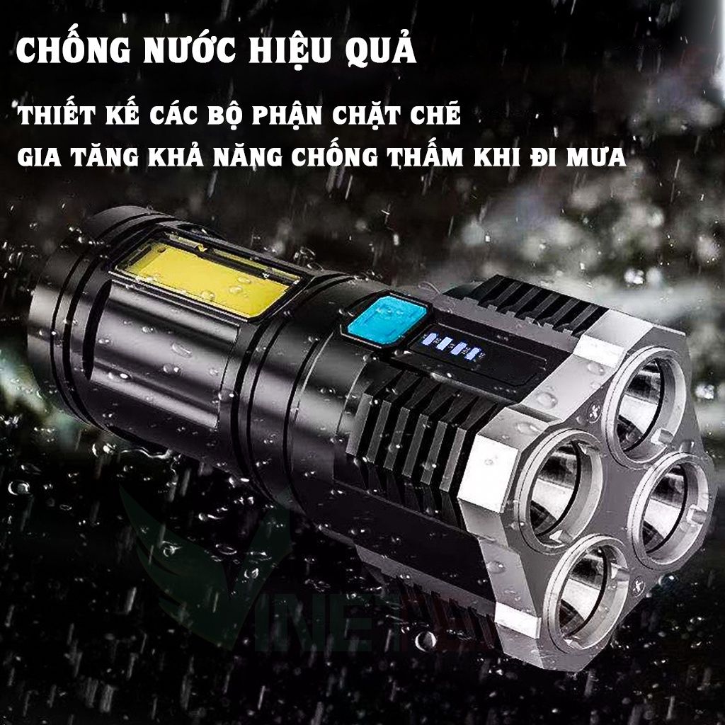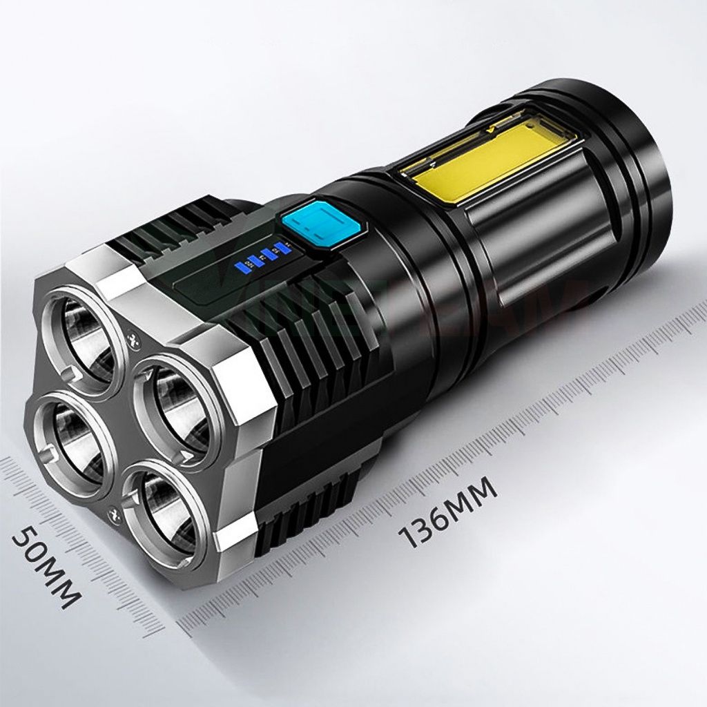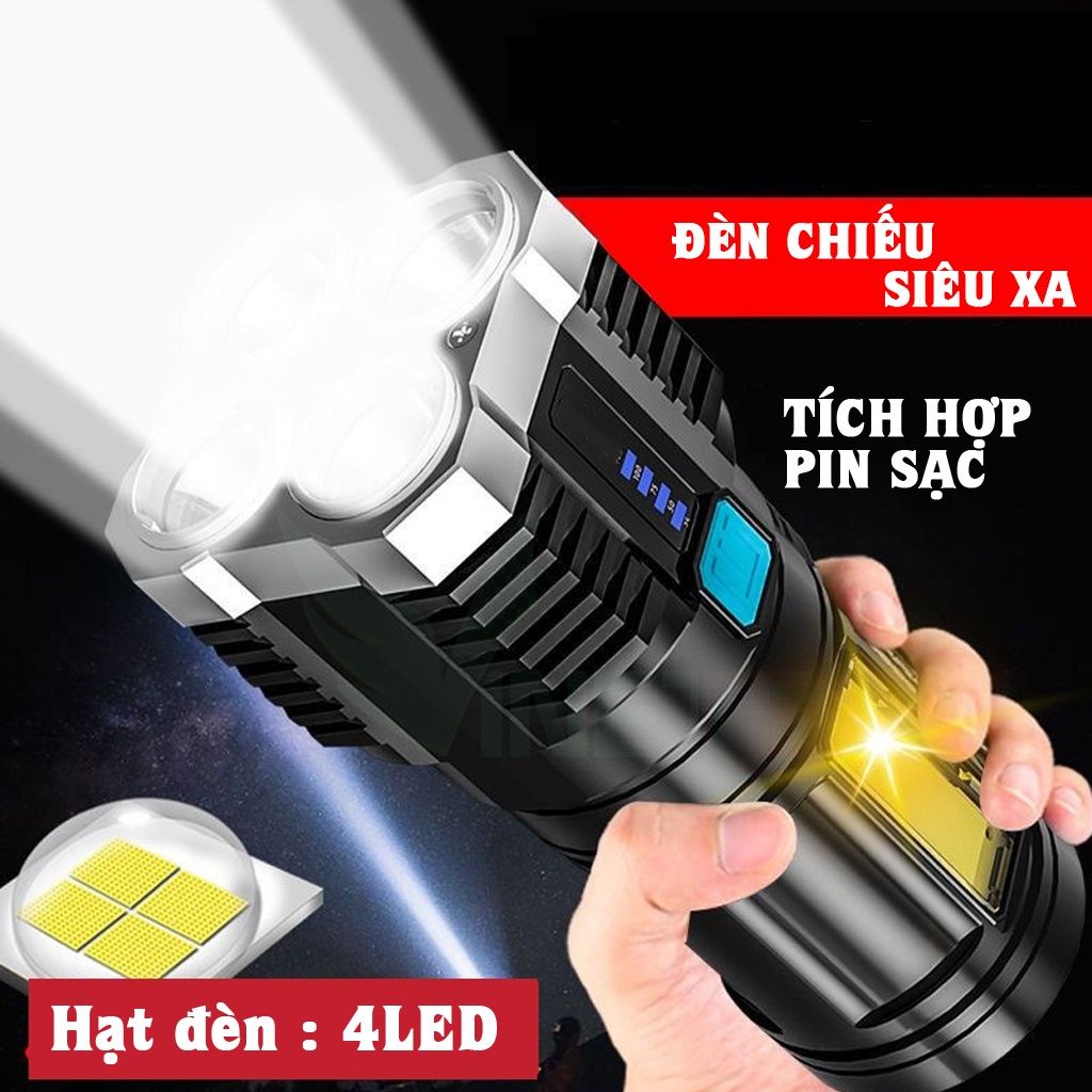 Đèn pin LED đa chức năng có thể sạc lại và nhỏ gọn để sử dụng tại nhà. Pin lithium có thể sạc lại dung lượng lớn tích hợp, nhiều phương pháp sạc USB, phạm vi dài, tuổi thọ pin dài, độ sáng cao, màn hình hiển thị điện thông minh, đèn bên sáng, thích hợp cho nguồn điện khẩn cấp khi cúp điện tại nhà. Sản phẩm cao cấp công suất lớn, chống thấm nước, đèn sáng mạnh, có thể chuyển đổi 4 cấp độ theo ý muốn [ánh sáng mạnh-trung bình-ánh sáng nhấp nháy-COB hông]