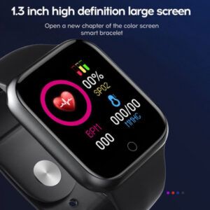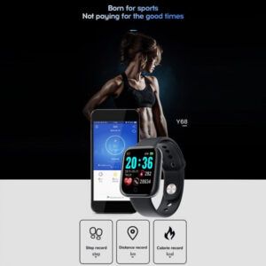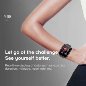 Dây đeo làm từ nhựa TPU. Smart Watch Y68 có tính năng đưa tay lên màn hình tự động sáng. Sử dụng cổng sạc đầu USB-A được giấu bên trong dây đeo phía trên để xạc pin. Màn hình màu kích thước 1,3 inch nhỏ gọn, độ phân giải 240 x 240 pixel.