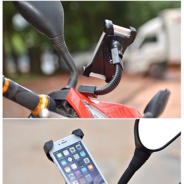 Giá đỡ điện thoại gắn cho xe máy là phụ kiện giá đỡ gắn vào chân kính chiếu hậu (lỗ 10mm) cho hầu hết chủng loại mô tô, xe máy hiện nay tại Việt Nam.