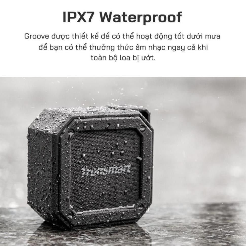 * Loa tronsmart Element Groove chống nước IPX7, thời gian chơi nhạc lên đến 24 giờ, là loa ngoài trời với âm thanh Bass trầm và sâu, tích hợp mic và hỗ trợ âm thanh nổi sống động. - Model: Element Groove - Màu sắc: đen - Chất liệu: ABS + aluminum - Thế hệ Bluetooth: 4.2 - Tương thích các chuẩn Bluetooth: A2DP, ACRCP, HFP - Đầu ra (watt): 10W - Khoảng cách đường truyền: 20m/66ft - Chống nước: IPX7 - Nguồn vào: DC 5V/1A - Dung lượng pin: 3.7V/2500mAh - Thời gian sạc: 3 giờ - Thời gian chơi nhạc: lên đến 24 giờ (âm lượng trung bình) - Dải tần số: 115Hz-15KH - Kích thước loa: 4.05 x 2.24 x 4.05in / 103 x 57 x 103mm - Trọng lượng: 463±5g / 13.33±0.2 oz - Chức năng khác: aux-in,hỗ trợ thẻ TF/Micro SD - Đơn vị điều khiển: 4Ω5W/50mm - Độ méo âm thanh: ≤1.0% - Sản phẩm bao gồm: 1 x Loa Element Groove , 1 x Dây audio 3.5mm , 1 x Cáp sạc USB-C ,1x dây buộc dù 60cm, 1 x Sách hướng dẫn sử dụng