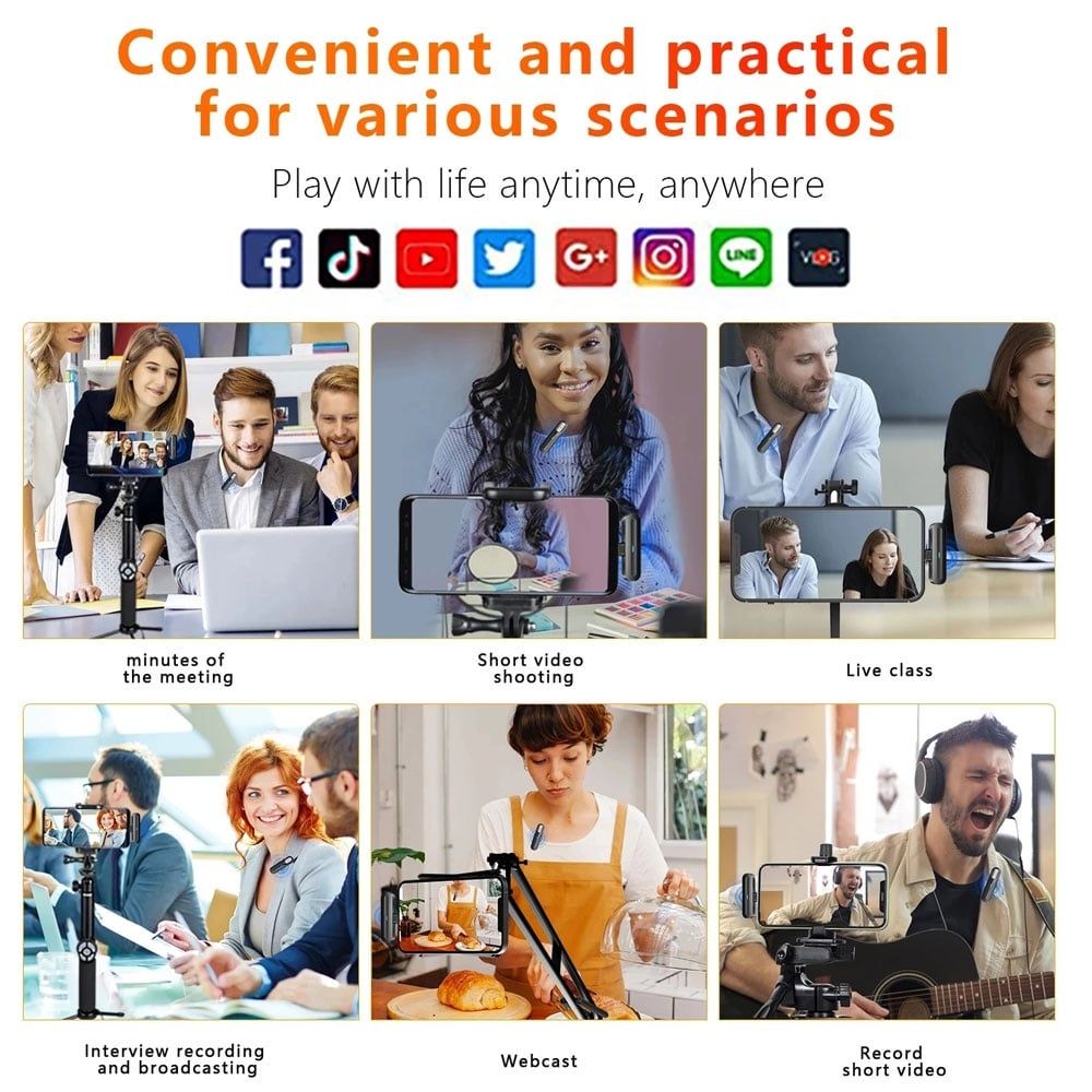 Plug and play, không cần ứng dụng hỗ trợ. Chỉ cần kết nối micro vào cổ áo, đầu thu với thiết bị của bạn và bật micro để tự động kết nối. Thiết kế nhỏ gọn và bền bỉ, dễ dàng kẹp vào áo giúp sử dụng thuận tiện hơn. Sử dụng công nghệ không dây mới 2.4G: giao thức truyền dẫn riêng, thuật toán nén âm thanh. Kết nối ổn định, bắt sóng nhạy, chống nhiễu mạnh, đảm bảo tín hiệu ổn định ở khoảng cách xa hơn 20m. Tương thích tốt, hỗ trợ đồng thời điện thoại di động / PC / máy tính bảng. Thời gian sạc khoảng 1 giờ. 🎤 Bộ Micro Thu Âm Không Dây - Lựa chọn hoàn hảo cho trải nghiệm thu âm và truyền trực tuyến chất lượng cao! 🎤
