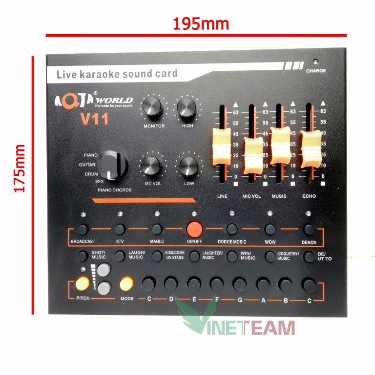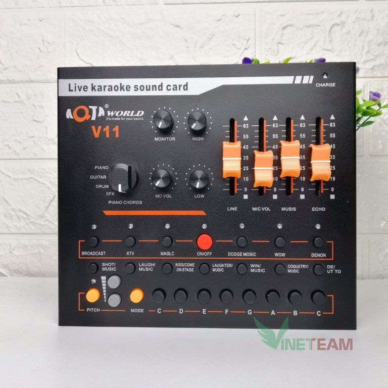 Giới Thiệu Sound Card Thu Âm AQTA V11 Đa Năng Hát Karaoke Và Livestream - Tương thích với hầu hết các thiết bị - Có thể Kết nối với đàn Piano, đàn guita, bộ trống. - Tích hợp sẵn 14 hiệu ứng đặc biệt như vỗ tay, tiếng cười, hò hét… - Đầu vào và đầu ra đa rạng hơn như có cổng Micro, mic và tai nghe… - Sử dụng chip âm thanh DSP. Cho tín hiệu âm thanh rõ ràng, ổn định - Tựơng thích với rộng rãi với các hệ điều hành như IOS, Android, PC. Thông Số Kỹ Thuật Của Sound Card Thu Âm AQTA V11 Đa Năng Hát Karaoke Và Livestream – Số kênh: 2in/2out – Tần số microphone: -42db +/- 1db SNR: >105dB(đầu ra) – >88db(đầu vào) – Dynamic Range: > 104db 20Hz-20kHz – Tần số đáp ứng: 0 + / -0.3db, 20Hz – 20kHz – Nguồn điện: 5v-0.5A – Công suất: 4.0w – Nhiệt độ hoạt động: 0-50*C – Độ ẩm cho phép: <40% – Thông số thu âm: 24bit/48kHz – Trọng lượng : 400g – Kích thước : 195x 175x 27 mm – Pin nguồn lưu trữ điện trong sound card, pin lithium: 1000 mAh – Tùy biến âm thanh đầu ra live stream( VOL). – Cổng live stream thế hệ mới cho âm thanh thu âm chất lượng hơn. – Sử dụng pin liên tục 4-6h. -Khả năng chèn các hiệu ứng âm thanh vào các đoạn thu như tiếng vỗ tay, tiếng hò reo, nhạc cổ vũ, tiếng chim kêu… với 12 hiệu ứng âm thanh, sẽ đem lại cho bạn trải nghiệm thu âm vô cùng thú vị. #soundcardthuam #aqtav11