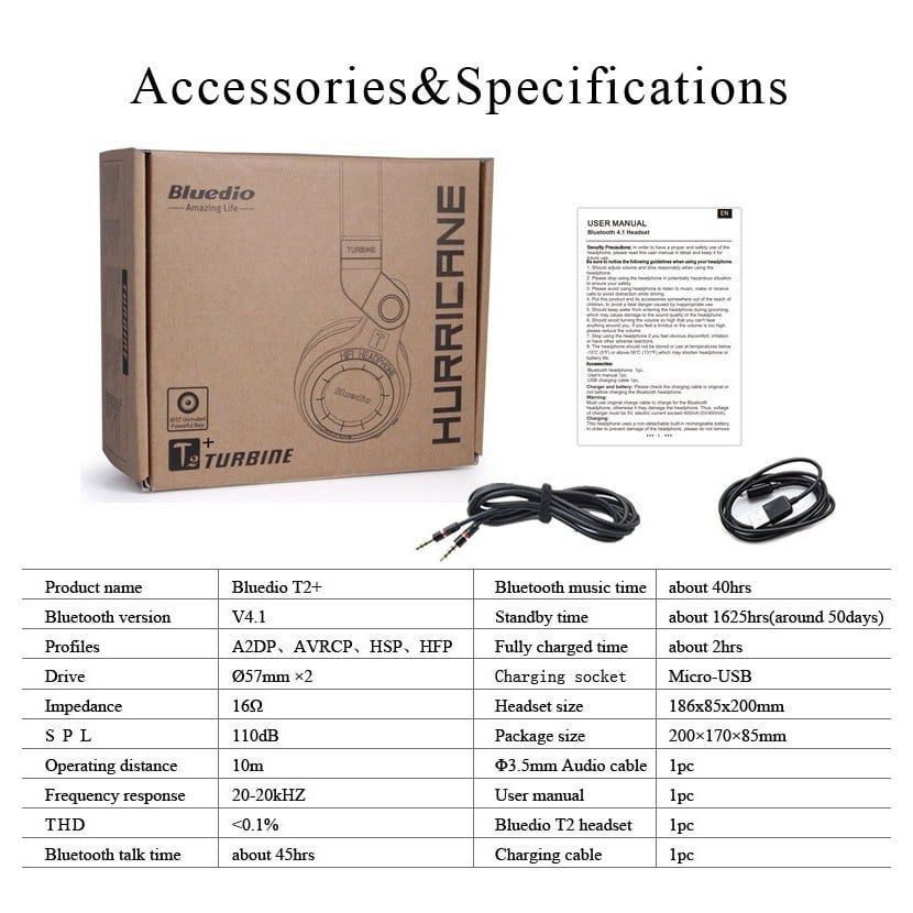 Là phiên bản nâng cấp sáng giá từ chiếc Bluedio T2, Bluedio T2+ không chỉ là một tai nghe bluetooth, mà còn là một tai nghe có dây, nó vẫn có thể được sử dụng khi pin yếu. Bên cạnh đó t2+ cũng hỗ trợ thể nhớ micro SD và Fm radio, việc này khiên T2+ trở thành một máy nghe nhạc di động với chất lượng âm thanh khá và thời lượng pin cực khủng. Để biết thêm chi tiết cũng như chấ âm của tai nghe bluedio T2+ này xin các bạn vui lòng đón đọc bài đánh giá Tai nghe bluetooth Bluedio T2+ cơn lốc âm nhạc