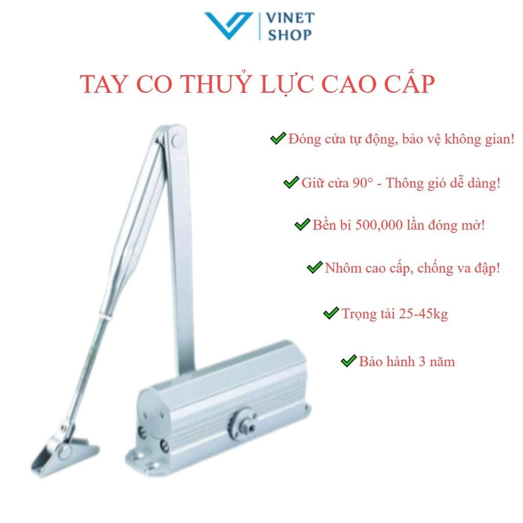 tay co thủy lực (tay đẩy hơi) là thiết bị giúp đóng cửa tự động. Khi cửa mở, lực lò xo của tay co sẽ kéo cánh cửa vào và đóng lại một cách tự động, tạo sự thoải mái, tiện lợi.