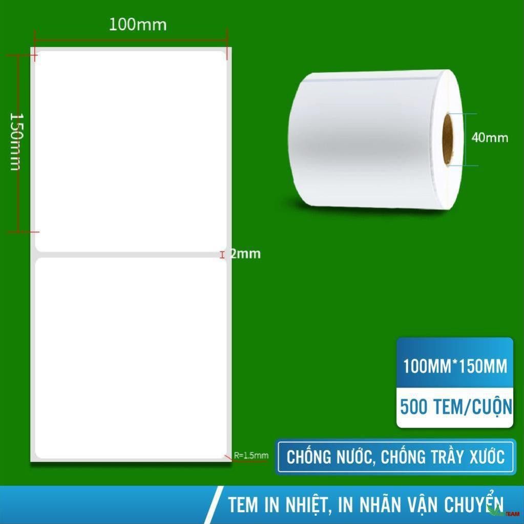 Cuộn 500 tem nhiệt, giấy in nhiệt dán sẵn khổ 100x150mm (Ngang: 100mm - Dọc 150mm), chuyên dùng để in tem dán, tem nhãn, in vận đơn, phiếu giao hàng TMĐT, in đơn hàng Shopee... Công dụng sản phẩm: - Sản phẩm có độ trắng cao, tích hợp keo dán sẵn, chỉ việc in xong và bóc ra dán lên sản phẩm, vỏ hộp, vỏ thùng, dán lên kiện hàng TMĐT, đơn hàng Shopee... mà không cần mất công dán đè băng keo hay làm thêm thao tác gì khác. - Tem nhiệt in đơn hàng, vận đơn khổ 100x150mm sử dụng được với tất cả các loại máy in nhiệt như Xprinter, Godex, Gprinter - Tem dạng cuộn treo, có thể in hàng loạt đơn hàng một lúc, giúp tiết kiệm đáng kể chi phí và công sức in tem nhãn, in vận đơn TMĐT, in đơn hàng Shopee... cho các chủ shop kinh doanh online có số lượng đơn hàng ngày lớn.
